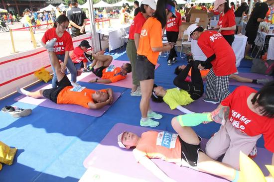 现场为跑者朋友们设置了游戏互动区,踢毽子、滚铁环、三人跳绳等游戏的设置,让大家重温儿时的记忆