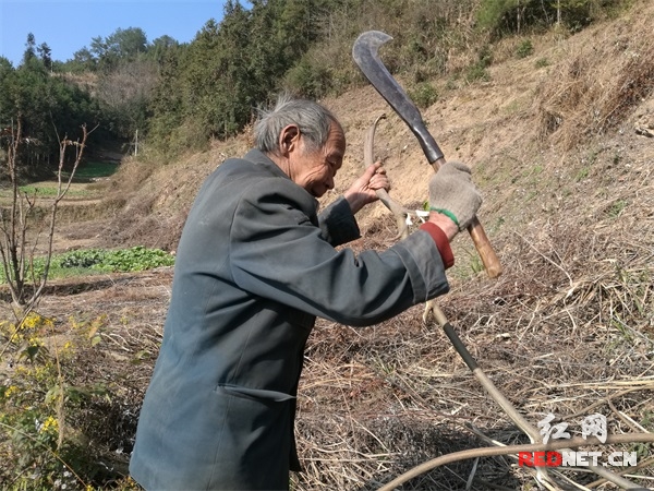 12月26日,笔者在大熊山蚩尤屋场山后的菜地里找到了这位老人,他头发斑白,衣服破旧,精神烁烁,正在一菜地边的山埂旁整理被他砍下来的茅草,右手戴着的白色手套已经发黑,手中拿着刀不停的砍着,长满老茧的左手不停的扯着凌乱的枯草杂枝,那被掩盖的菜地也就慢慢的露出脸来。走近跟他打招呼时,他开始只是微微回头,并没有说话,只顾憨笑着,满脸的皱纹里绽放出比阳光更温暖的笑容。慢慢的熟络了之后,他才渐渐的打开了话匣子。