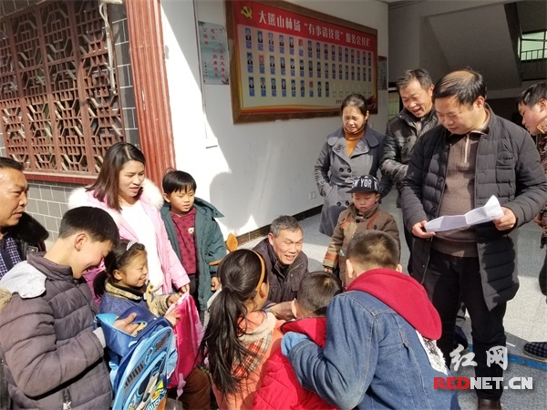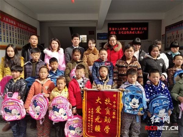 红网时刻娄底2月7日讯(杨建长 报道)2月6日,中华儿慈会“童心为爱帮扶计划”助学金发放仪式在新化县大熊山林场举行。中华儿慈会长沙办事处负责人许东、卓凡爱心书架基金会周丽辉、卓凡教育集团总裁周宗凡、娄底市旅游局驻大熊山扶贫工作组看望慰问困境中的孩子们。