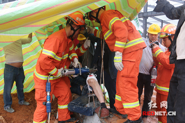 14时35分,消防官兵到达现场,据工地负责人介绍,伤者是建筑工地的水泥工人,在施工时不慎从脚手架摔至地面,两根长约1.5米、直径约1厘米的钢筋贯穿大腿,情况十分危急。现场指挥员在与120医护人员商讨后,立即命令救援的官兵利用液压剪对钢筋进行剪切,同时与现场工人一起扶着钢筋,防止剪切过程中对受伤工人造成二次伤害。经过15分钟的紧张施救,消防官兵成功地将插入工人身体的钢筋分成两截,随后小心翼翼地将受伤工人抬上担架,送往医院做进一步抢救。