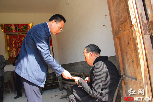 娄底市民政局党组书记、局长邓志洪(左)走访贫困户并送去慰问金。