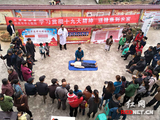 在现场,市纪委分发十九大精神宣传展板和资料,为村民宣讲十九大精神;市中心医院选派心内科、内分泌科、风湿免疫科、骨科、儿科、120急救站等多个学科资深专家前往,为村民热心义诊、免费发放药品、演示并手把手地教村民心肺复苏急救技术。