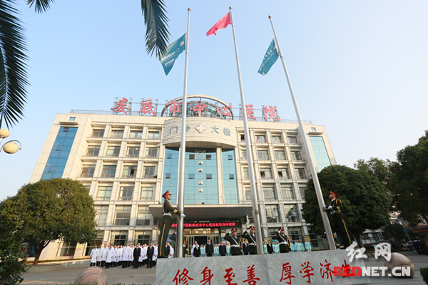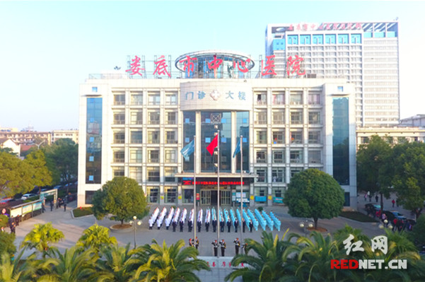 红网时刻11月28日讯(通讯员 黄小红 刘素凤)11月27日清晨,娄底市中心医院180余名医务人员整装列队,举行升国旗,并首次升院旗仪式。市政协副主席、市中心医院院长肖扬、市中心医院党委书记倪志铭等全体院领导参加升旗仪式。