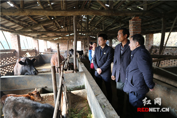在历树组,扶贫人员到来时,谢应文正在打扫屋前卫生。谢应文有两个儿子,大儿子4岁时就出现神经性听力障碍,谢应文带着他四处求医,几年时间仅医药费就花了20多万元。2013年前,谢应文以挖窑为生,煤矿关停后,谢应文一家的生活就陷入了困境。后来,在娄底市烟草专卖局扶贫工作队的帮助下,成为了养牛大户。如今,谢应文和妻子周另红,凭借勤劳的双手,养了50头母牛,50多头肉牛,还种了100多亩牧草,年收入可达16万元,预计今年底就可以还清外债彻底脱贫。