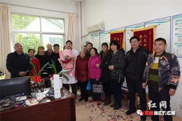 十几位中老年朋友手捧鲜花、锦旗到双峰县人民医院感谢好医师赵仁厚。
