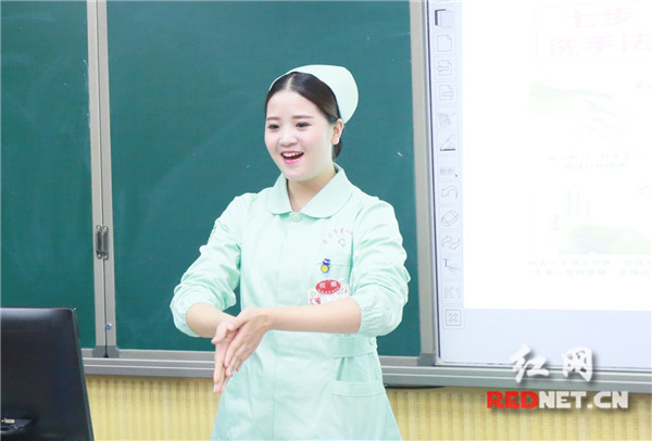 课上,娄底市中心医院二十三病室(儿科)主任、儿科教研室主任姜新萍教授以《儿童流感知识讲座》为题,针对儿童的兴趣与特点,配合简单明快的图片和PPT,用通俗易懂的语言细致讲解了流感的表现症状、处理措施及预防举措。随后,该院神经内科护士姜颖在讲台上讲解示范了标准的“七步洗手法”,教导小朋友们如何正确清除手部污物和细菌,防止病从口入,减少流感细菌的传播。在医护人员的耐心教导下,小朋友们专心听讲、积极回答问题,宣讲活动取得了良好的效果。