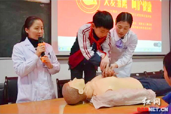 娄星区人民医院(娄星区妇幼保健院)副院长、大儿科主任易赛君作如何预防意外伤害讲座,她重点讲解了如何防溺水、气道异物、动物咬伤、烫伤、鼻出血等5种意外伤害,同时,医护人员在现场还为孩子们演示徒手心肺复苏(CPR),对抢救者体位、按压部位、按压深度、按压频率、按压姿势、畅通呼吸道、人工呼吸等步骤详细地进行了讲解和示范,并让学生对人体模特进行实战操作,让在场的师生掌握正确的急救方法,提高老师和孩子们的安全意识。
