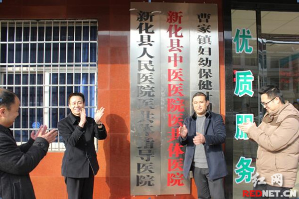 新化县人民医院副院长鄢凯初(右二)与曹家镇卫生院院长伍锋(左二)共同揭牌。