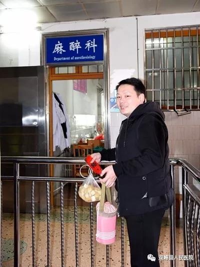 温馨一幕。大年初一早上,麻醉科门口一位职工家属给他上班的老婆送来早餐。
