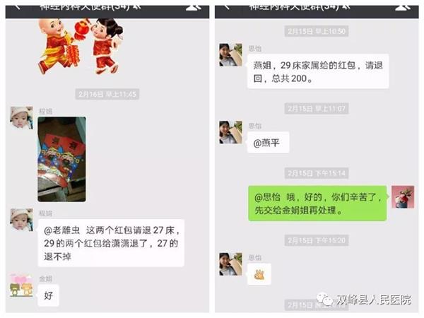 在春节七天假期中,双峰县人民医院紧扣医疗质量与安全生产这一主线,多方举措,各项工作有序运行,确保广大患者度过了一个欢乐祥和的平安佳节。另外,医院的医德医风也亮点纷呈,拒收红包的现象比比皆是,如四病室蒋豪杰医生、八病室护士思怡、程娟等,都将病人给的红包退还。