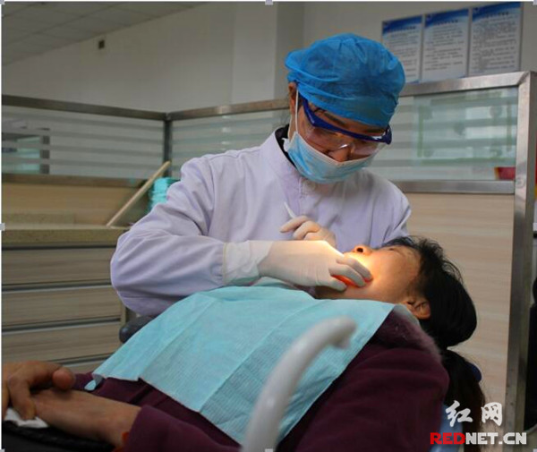新化县人民医院口腔科主任彭雄南在帮患者实施无痛微创拔牙。