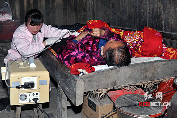 乐桃香是古台山林场横茶工区二组村民,今年65岁,中风长达12年之久,由于行走不便,她不能去集中服务点接受免费检查。得知情况后,医护人员就带着B超仪等检测设备上门服务。村民曾飞刚生了小孩,医护人员就上门为他检查产后恢复情况。“一个都不能少”是此次集中服务活动的目标。