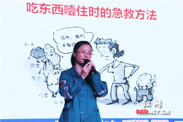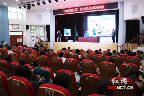 现场,该院儿科副主任、副主任医师罗恒,围绕《意外伤害急救》从烫伤急救、轻度食物中毒处理、吃东西时噎住的急救方法、癫痫发作时怎么办、溺水急救等方面进行了详细讲解。台上的特教老师则根据专家所讲内容,通过手语的方式同步为学生进行辅助示范,使学生更直观的理解应急急救知识。