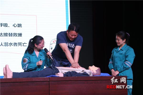在互动环节中,罗恒邀请老师上台示范,面对面为学生讲解突发癫痫的急救流程,指导大家如何科学正确地掌握意外现场自救互救原则和方法。