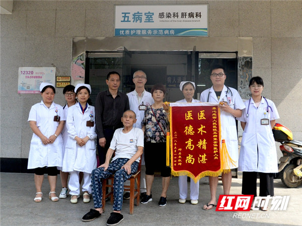 红网时刻娄底5月23日讯(通讯员 肖金华)5月18日,阳光灿烂,84岁高龄的退休老干部邓老在亲人的陪伴下出院了。看着被某三甲医院的医生宣判三天生存期的老父亲在三月余后顺利出院,邓老的儿子握着主管医生的手一个劲地说道:“谢谢你及科室全体医护人员的精心治疗,你们辛苦了!”说着还恭敬地送上早就准备好的锦旗到双峰县人民医院李张医生手上。